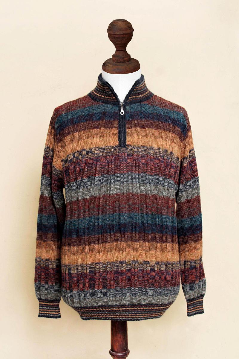 Backed by our 100% Happiness GuaranteeWarm red and orange mingle with blue, grey and charcoal in this cozy men's sweater. By Fernando Cano, the alpaca wool design features a zippered turtleneck. It is knitted of luxurious alpaca wool, long prized for its lightweight warmth.