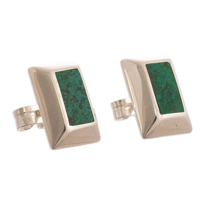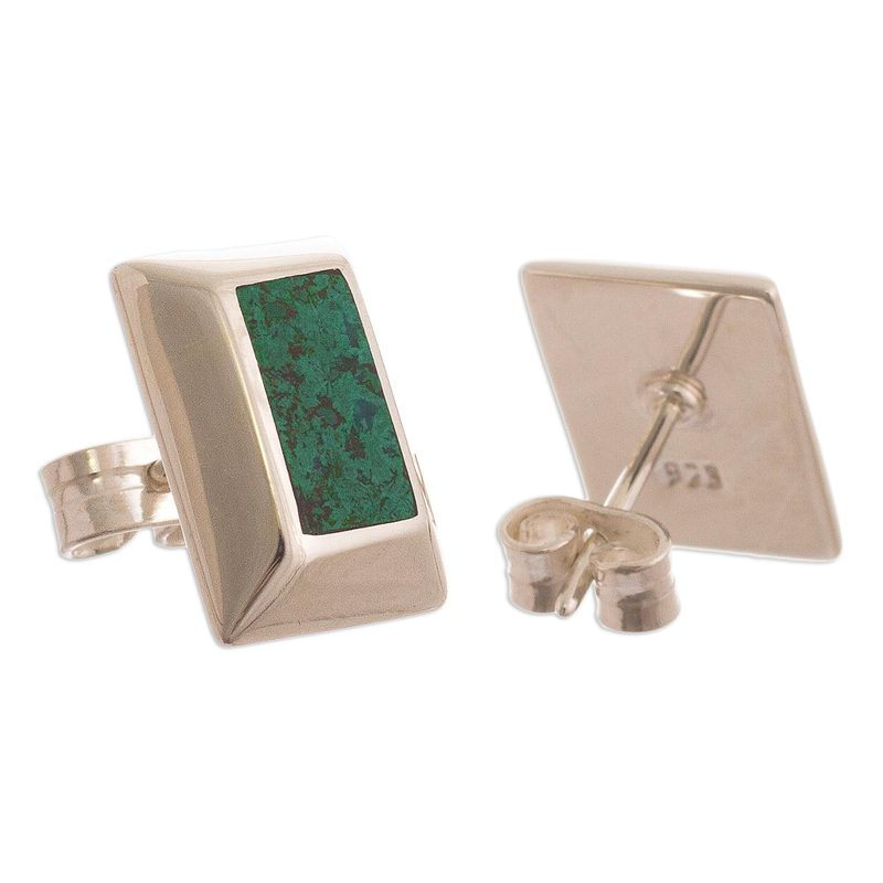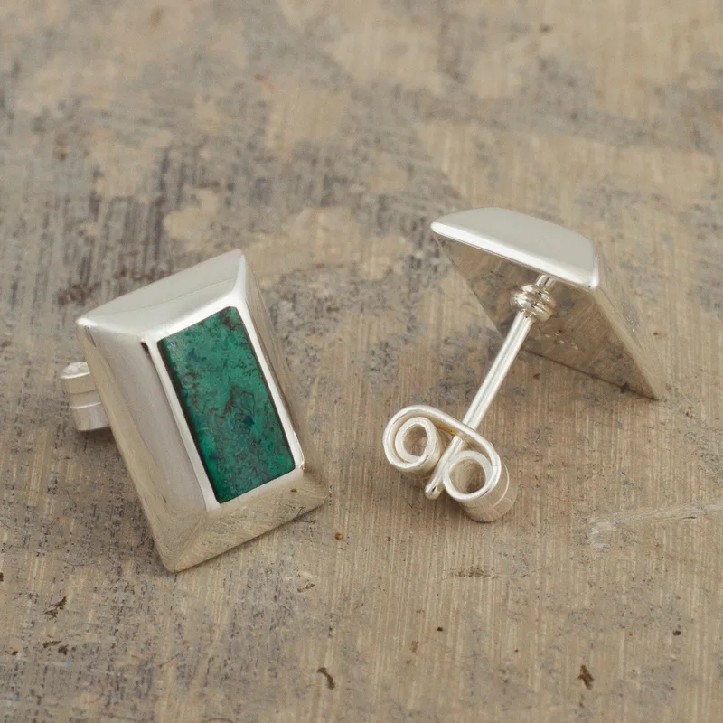 Presented by Yan Fredy Bolivia of Peru, these button earrings feature chunky frames of high-polish sterling silver with inlaid rectangular cabochons of natural chrysocolla. Chrysocolla is a gemstone often associated with forgiveness, peace, and the strengthening of emotional bonds and ranges in color from light green to deep blue.