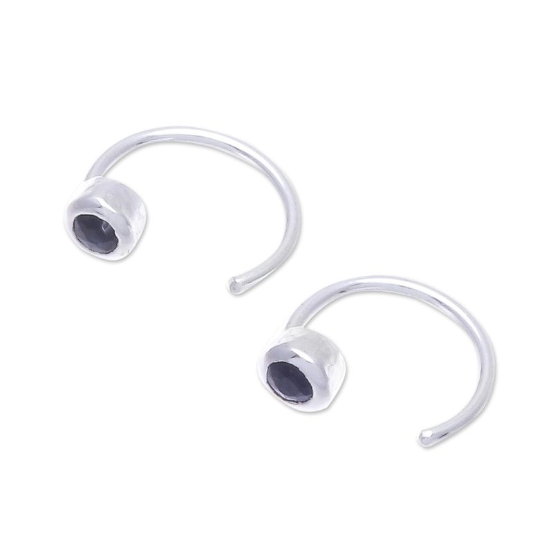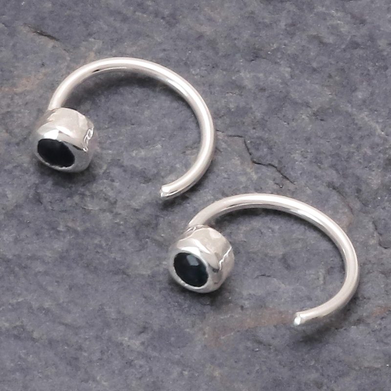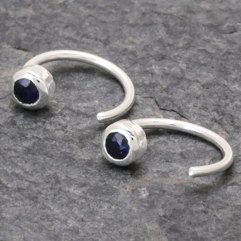 Always creative, Jantana crafts a delightful pair of earrings with half hoops that curve from back to front. The petite sterling silver pair showcases sapphire and is perfect for office wear, casual times and dressier occasions.
