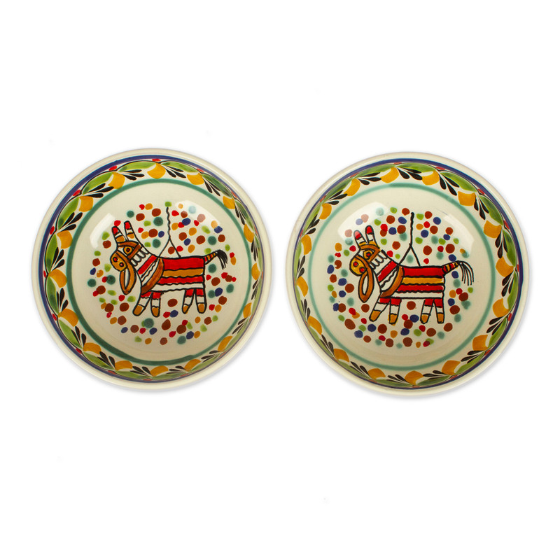 Delivery EstimateAdd a touch of Mexican festivity to your kitchen or dining room with this pair of bowls from Mexico. Gorky Gonzalez crafts these bowls from ceramic, painted by hand with the image of a piñata alongside other festive designs. The back of each bowl is signed with the artisan's initials, as well as the letters "AT" for Alfarería Tradicional (Traditional Pottery).