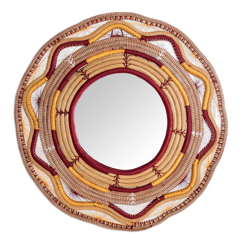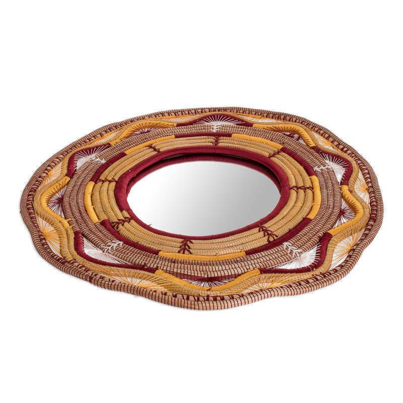 Backed by our 100% Happiness GuaranteeBrighten up any room with this gorgeous mirror by Tamara Pereira. She frames it in thick pine needle ropes and creates a colorful pattern with yarn in bright mustard and crimson tones. A hand-stitched design made with fine threads adds a delicate and very feminine touch. The artisan has fitted the item with a hanging loop for easy installation.