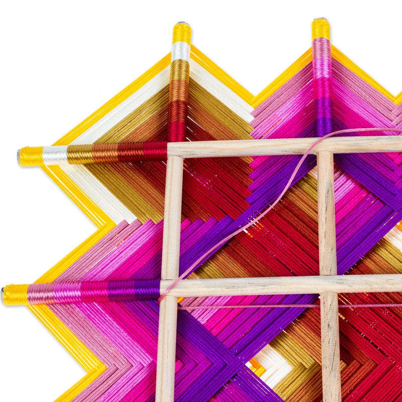 Mexican artisans Fher and Armando draw inspiration from mandalas to handweave this sweet design with polyester threads in pink, yellow and copper hues. Featuring a geometric pattern, this wondrous decorative item will bring a modern and spiritual aura to your interiors, with a sturdy pine wood structure allowing you to display the artwork in all its beauty.