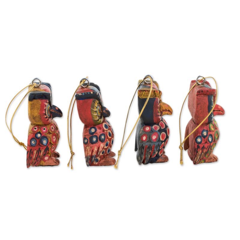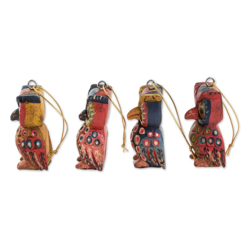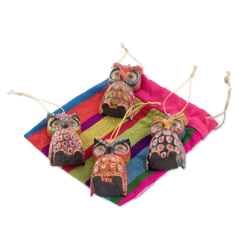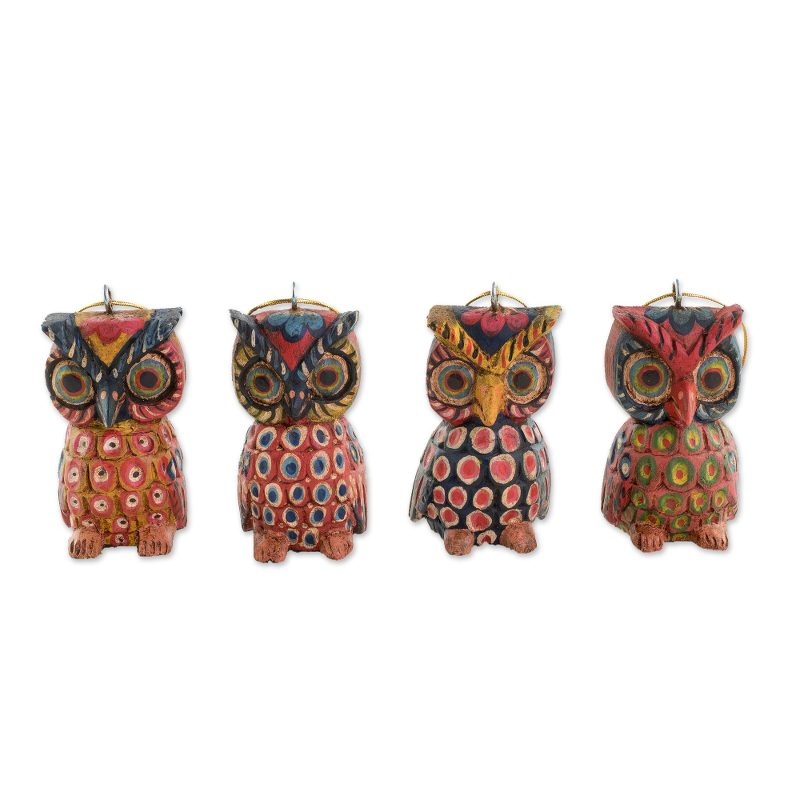 Perfect for celebrating the holiday season, this set of four ornaments depicts a group of owls that grace your tree. Designed by Guatemalan duo Juan and Carolina, each ornament is hand-carved of pine wood and painted with colorful floral motifs and other designs. The set arrives in a charming storage bag handwoven of cotton.