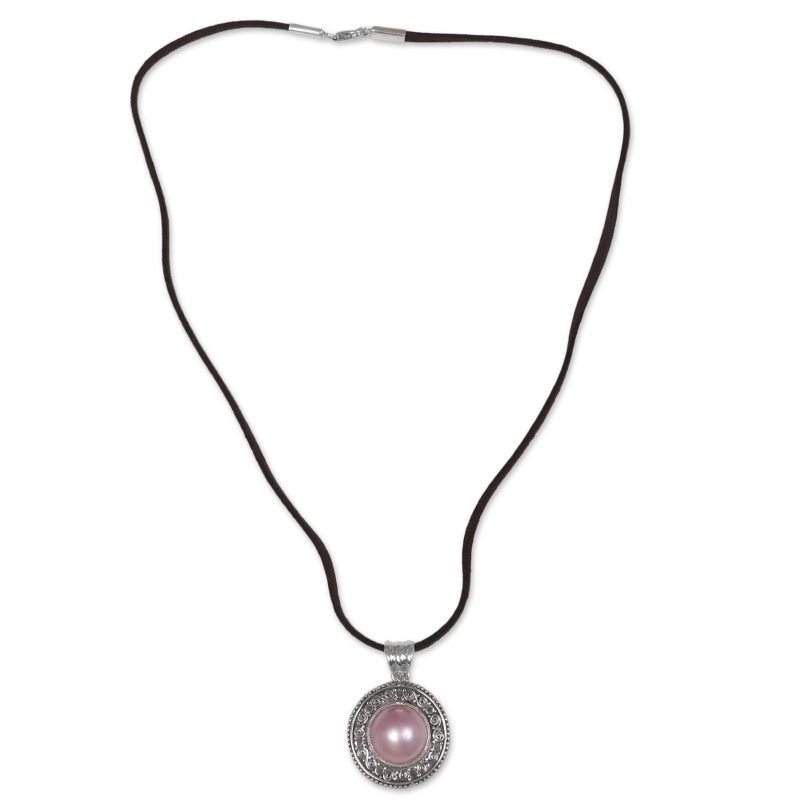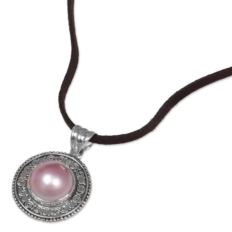 Hanging from a leather cord, a single cultured mabe pearl with pink hues is featured in the pendant of this necklace from Indonesia. Featuring an original design by Buana, the pendant necklace is handcrafted from sterling silver by local artisans for a truly beautiful appeal.