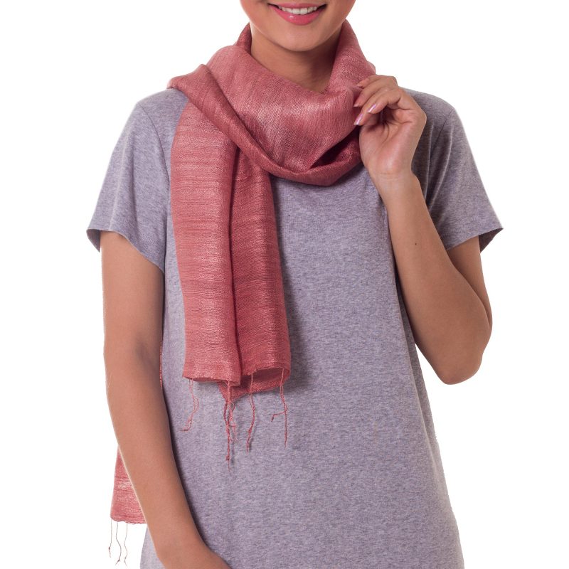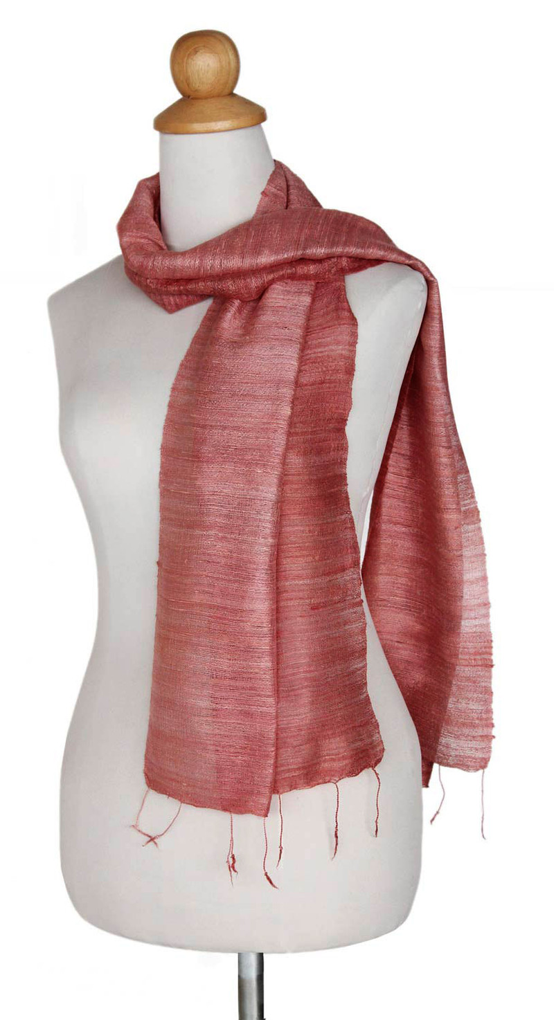 Soft pink turns into deep rose in a delicious palette of colors orchestrated by Vinita. She works with traditional dyeing techniques to create a scarf of bold elegance that is loomed of raw silk.