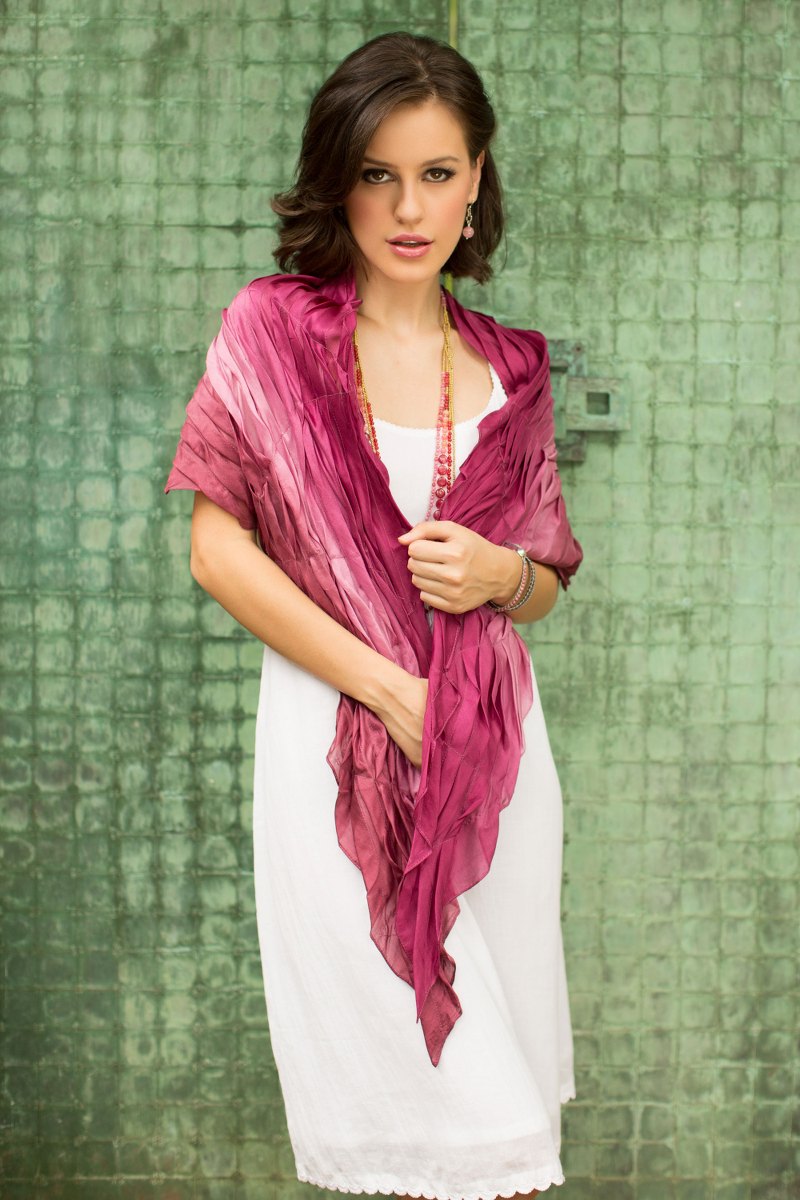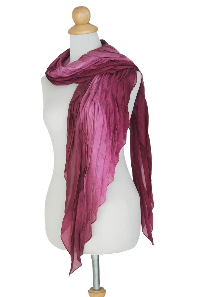 Blossoming shades of berry and pink bathe this scarf with exotic elegance. Designed by Vinita, the pleated scarf with angular ends is woven of pure silk.