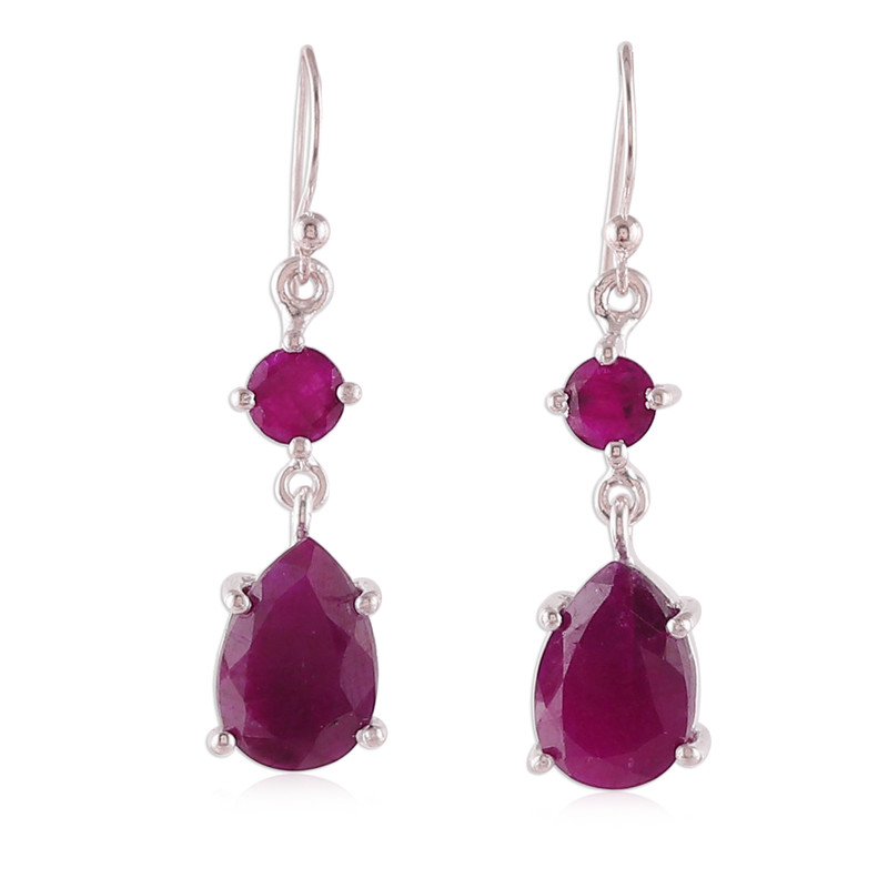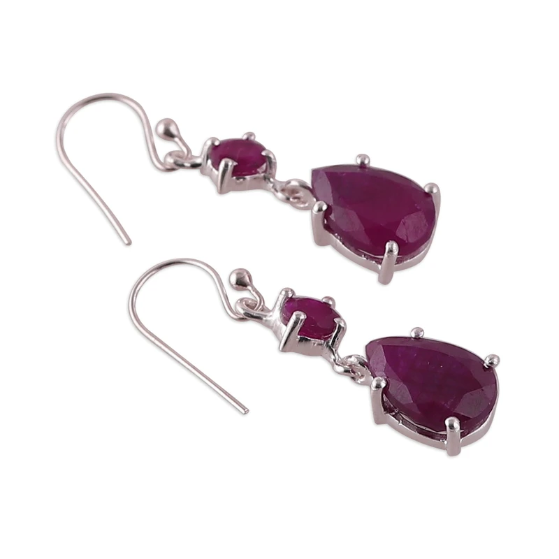 The capricious colors of faceted ruby jewels bring charming beauty to this design, presented by India's Alok Jain. Crafted of polished sterling silver, these dangle earrings showcase the gemstones in a combination of pear and round cuts, totaling seven carats of complete luxury.