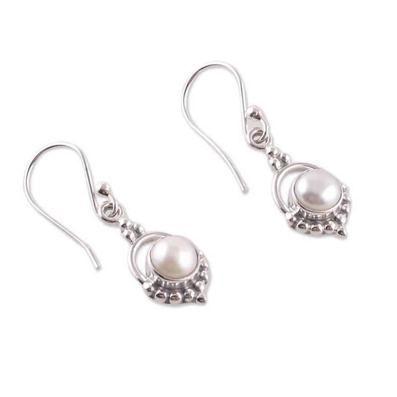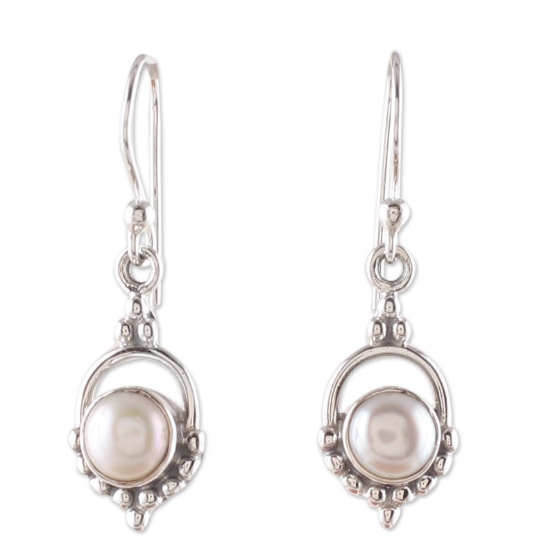 Gracefully adorned with advanced silversmithing, Narayannii's design boasts the beauty of cultured pearls in a natural cream hue, symbolizing innocence and purity. Crafted by local Indian artisans with expertise in jewelry arts, these sterling silver dangle earrings in a polished finish complement the gems' charm with classic accents that exude elegance.