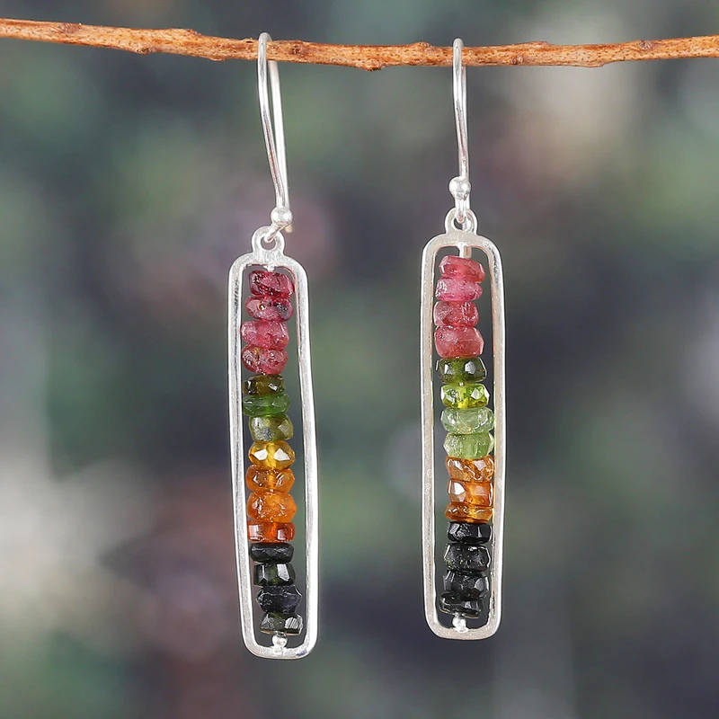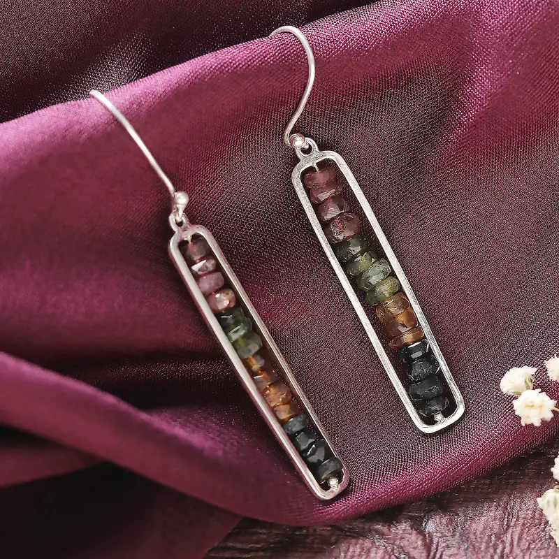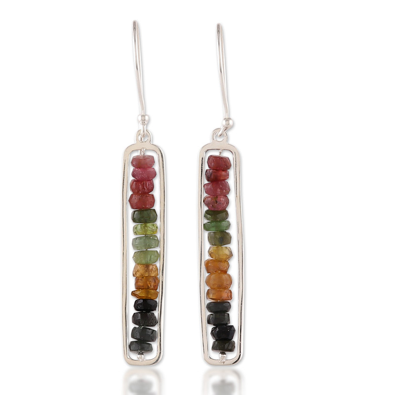 Stacks of rondelle-cut tourmaline in natural watermelon shades from pink to olive, form these modern earrings framed in sterling silver. Tourmaline is prized forit's conduit of imagination, joy and prosperity.