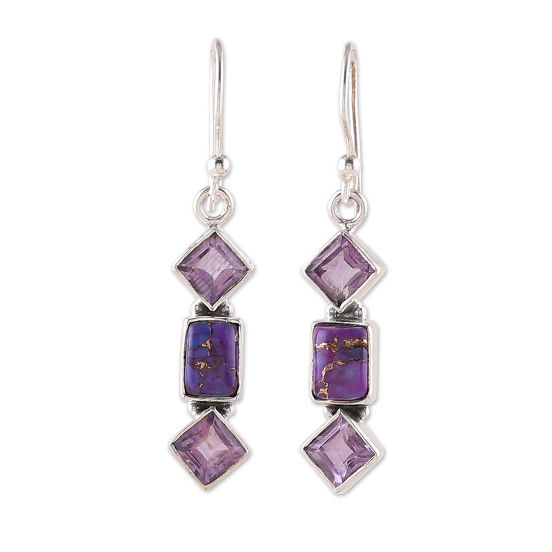 Backed by our 100% Happiness GuaranteeNarayannii's dangle earrings reunite you with your sophisticated side thanks to their glamorous jewel combination. This sterling silver design, crafted in India, features diamond-shaped amethyst stones—symbols of wisdom—ornamenting a pair of composite turquoise cabochons, often associated with self-love. Polished for an elegant look, the elements create a purple color scheme, representing luxury and nobility.
