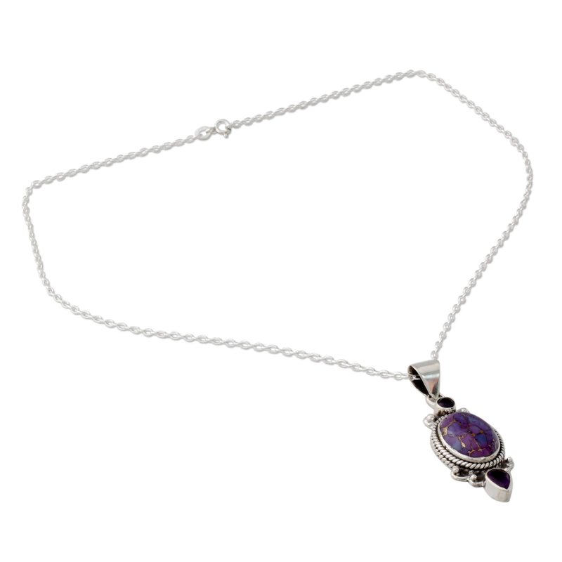 Backed by our 100% Happiness GuaranteeFresh lilac-hued amethyst gems flank an oval cabochon of dreamy purple composite turquoise in this pendant necklace from India's Neeru Goel. Rope-edged bezels and tiny silver balls complement the stones in this original sterling silver pendant design. The pendant centers a classic sterling silver cable chain.