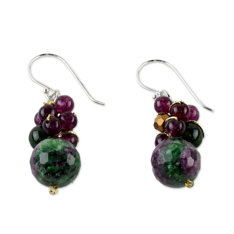 Resembling a bounty of ripe and luscious fruit, gemstone clusters tempt the eyes in these earrings from Thai artisan Nareerat. Dyed quartz is accompanied by bronze glass beads in clusters that swing from sterling silver hooks.