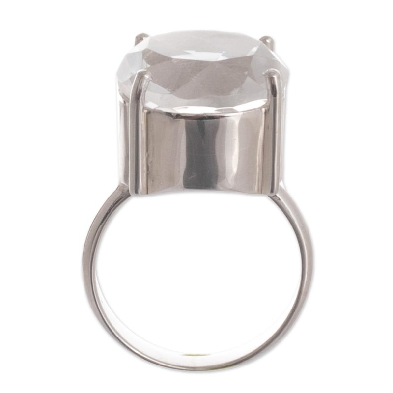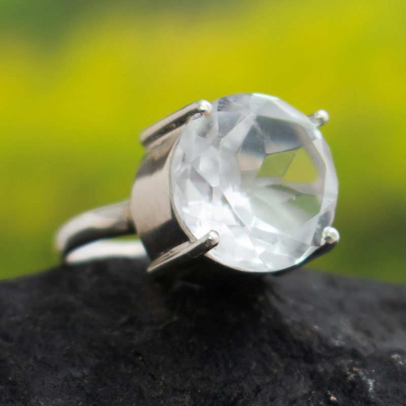 Sparkling quartz crystal crowns the design of this ring by Marianela Vargas. The 10-carat faceted quartz, that represents April´s birthstone, is credited with being one of the most protective gems. The ring is crafted by hand with sterling silver.