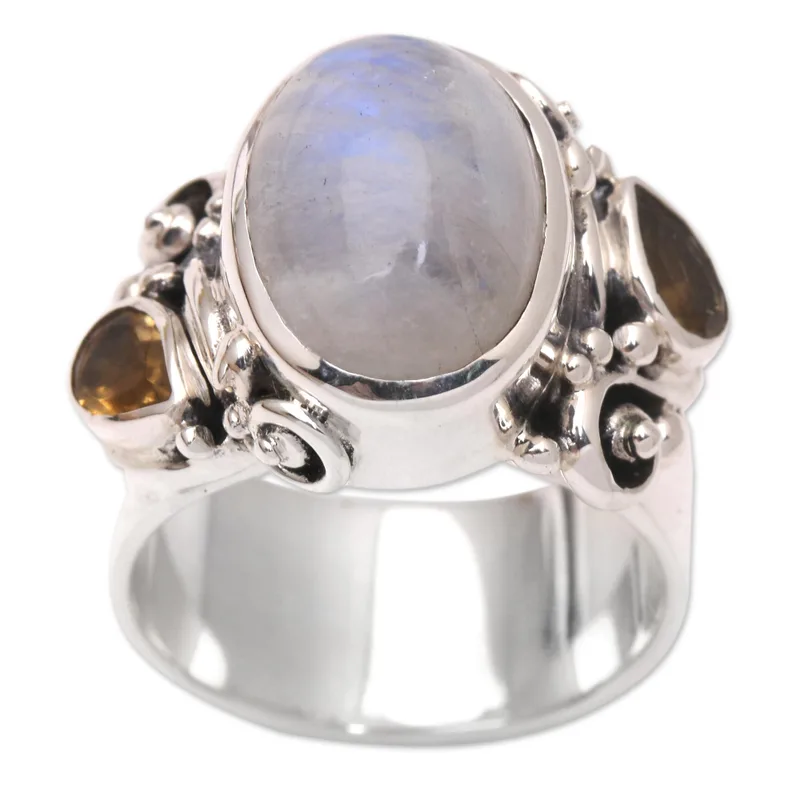 Bright yellow stones, bursting with color, balance the cool, iridescent rainbow moonstone on Buana's show-stopping cocktail ring. The Balinese artisan hand crafts the ring from smooth sterling silver, accenting the rainbow moonstone with faceted citrine.