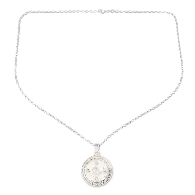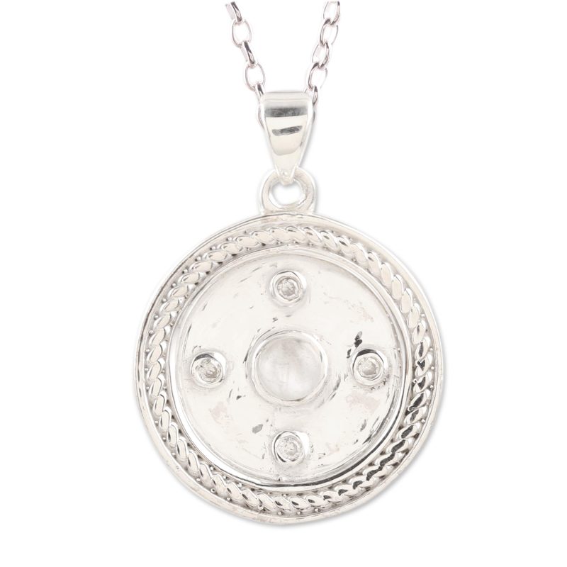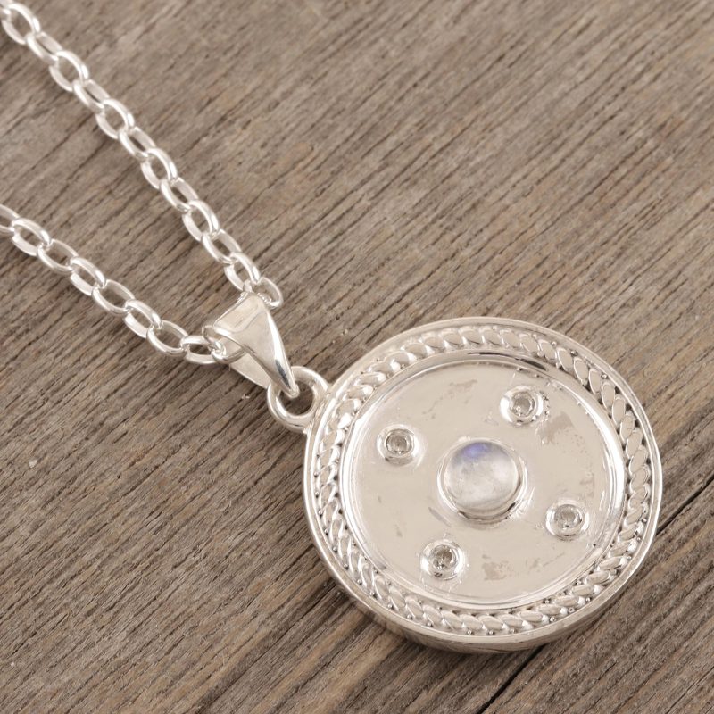 A ring of cubic zirconia gems circle a single rainbow moonstone at the center of Shivani Choudhary's stunning pendant necklace. The circular sterling silver pendant dangles elegantly from a sleek cable chain that fastens with a spring ring clasp.