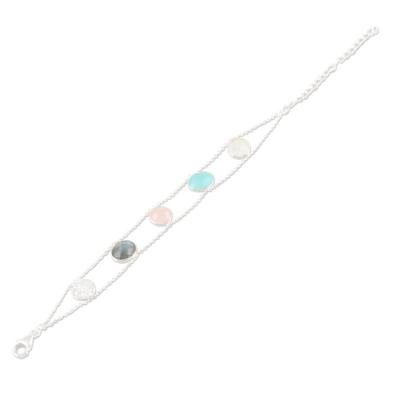 A quartet of faceted gemstones evoke the pinks and blues of a temperate seascape. India's Neetu Barathi uses chalcedony, rainbow moonstone, rose quartz, and labradorite charms to create the bracelet, adding a sterling silver coin to the quartet. Two sterling silver cable chains fasten with a lobster claw clasp.