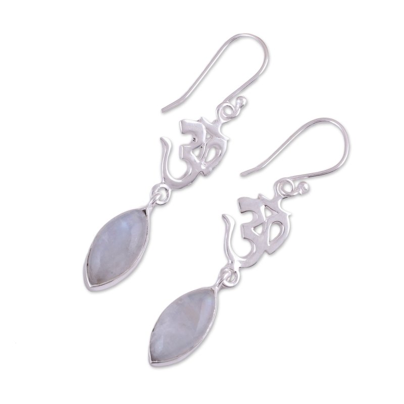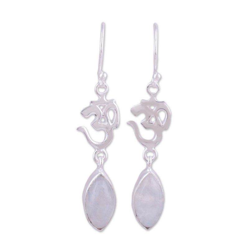Representing oneness with the universe, om is an important symbol for both Buddhist and Hindu cultures. Indian artisans craft two omkara of sterling silver, accented with cabochons of rainbow moonstone to dangle from the ears.