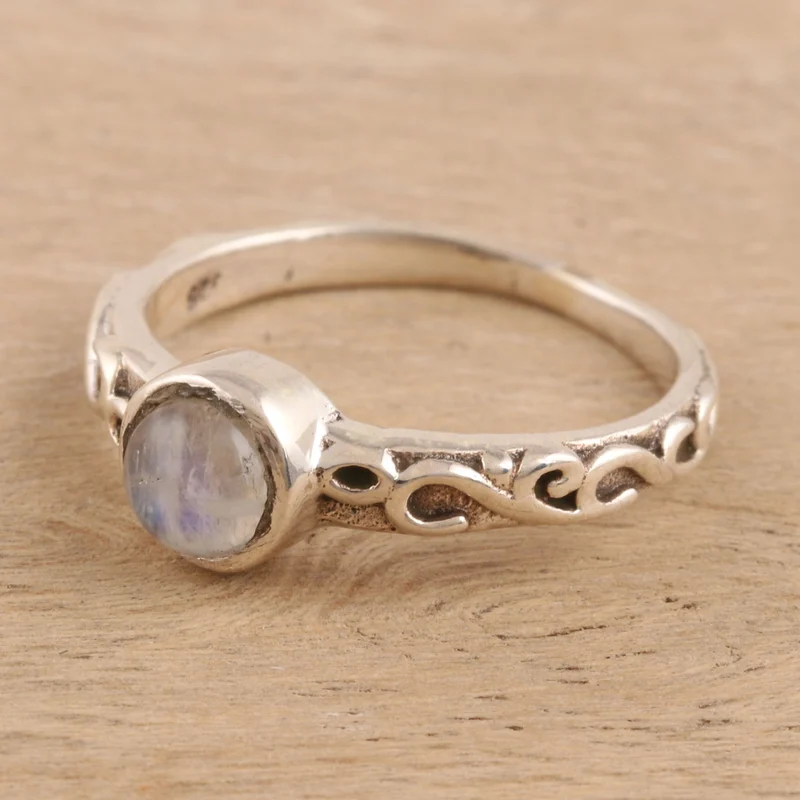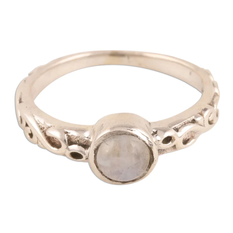 A misty globe of natural rainbow moonstone centers this beautiful solitaire ring from India. Designed by Rakesh Rana, this ring circles the finger with a band of sterling silver that is decorated with lavish vine patterns.