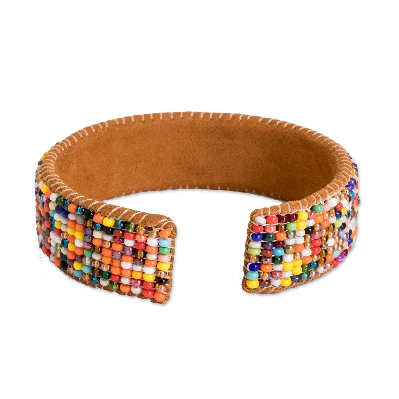 Backed by our Happiness GuaranteeDiverse colors and shiny elements merge in this celebration of beauty and charm. Guatemalan artisan Álvaro Ratzan works with talent and dedication in this glass beaded cuff bracelet, whose rainbow hues are gorgeously complemented by leather accents, allowing a comfy fit.