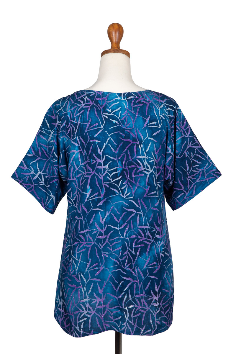 Backed by our 100% Happiness GuaranteeThis comfortable blouse by Bali's Galuh Kenanga features a V-neckline with short sleeves and a hi-low hem. Crafted of hand-stamped rayon batik, the pullover top depicts bamboo leaf motifs on a rich navy blue.