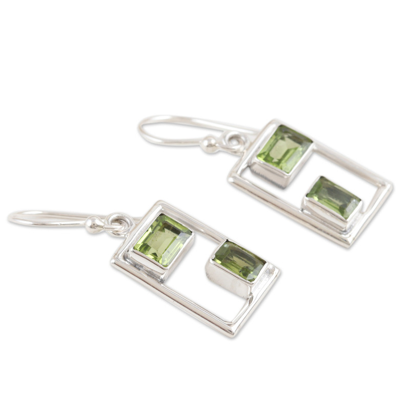 Rectangular peridot stones add a futuristic and elegant vibe to these sterling silver dangle earrings presented by India's Narayannii. With a high polish finish, the accessory is a beautiful complement to any outfit and an amulet of good fortune.