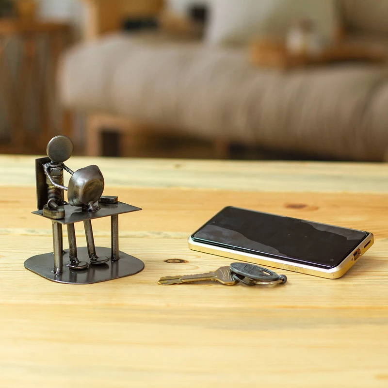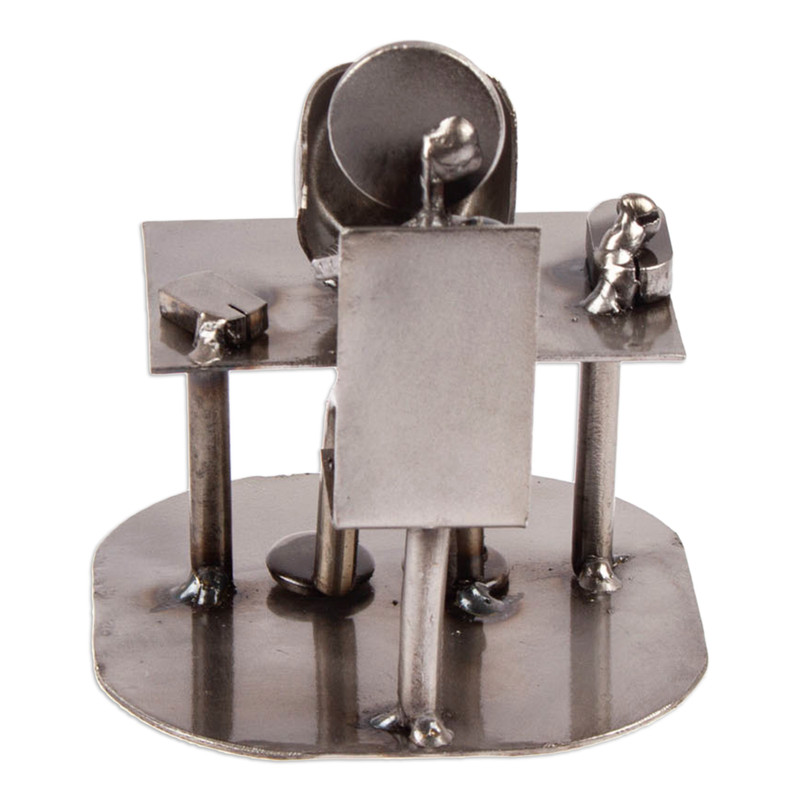 Armando Ramirez celebrates the advent of technology by recycling scrap metal into an IT specialist. The man sitting at the computer is shaped from a spark plug and long screws. The rest of the statuette features a wide variety of metal pieces that were discarded in die machines.
