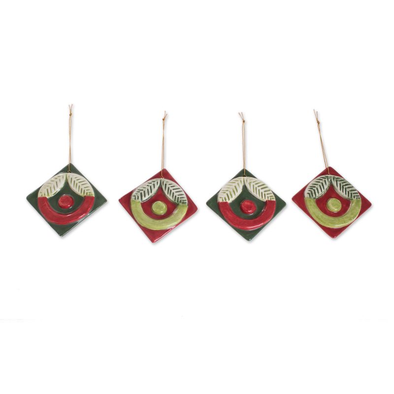 By Lilyan Benecke in Guatemala, these four square ornaments are crafted from ceramic to feature basket-like designs. Each ornament is given a glazed finish in hues of light and dark green that contrast with red.