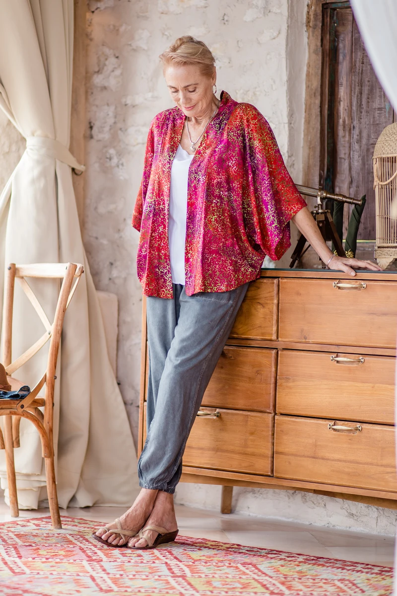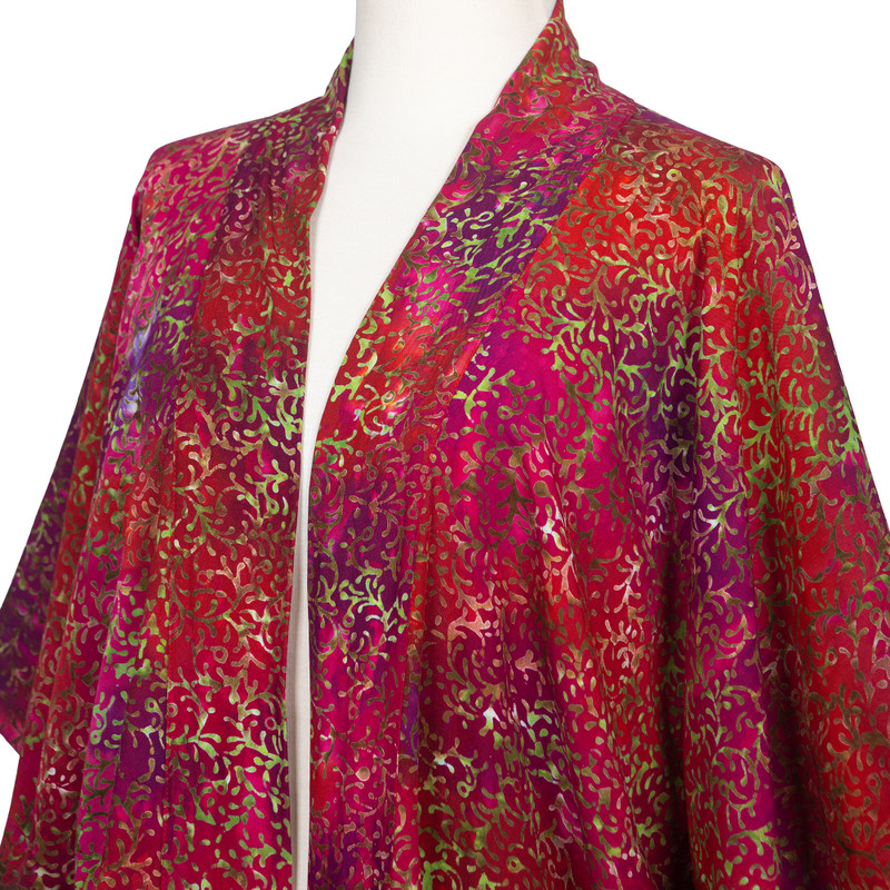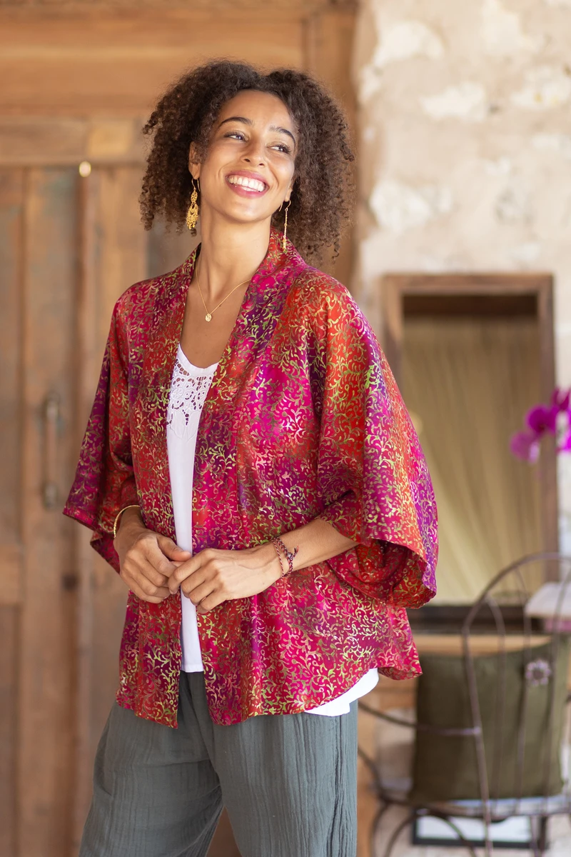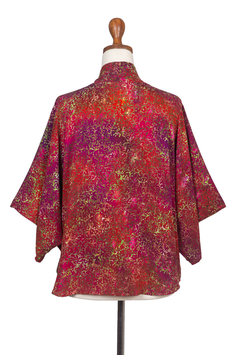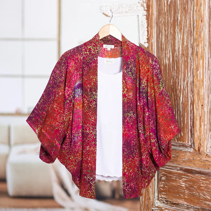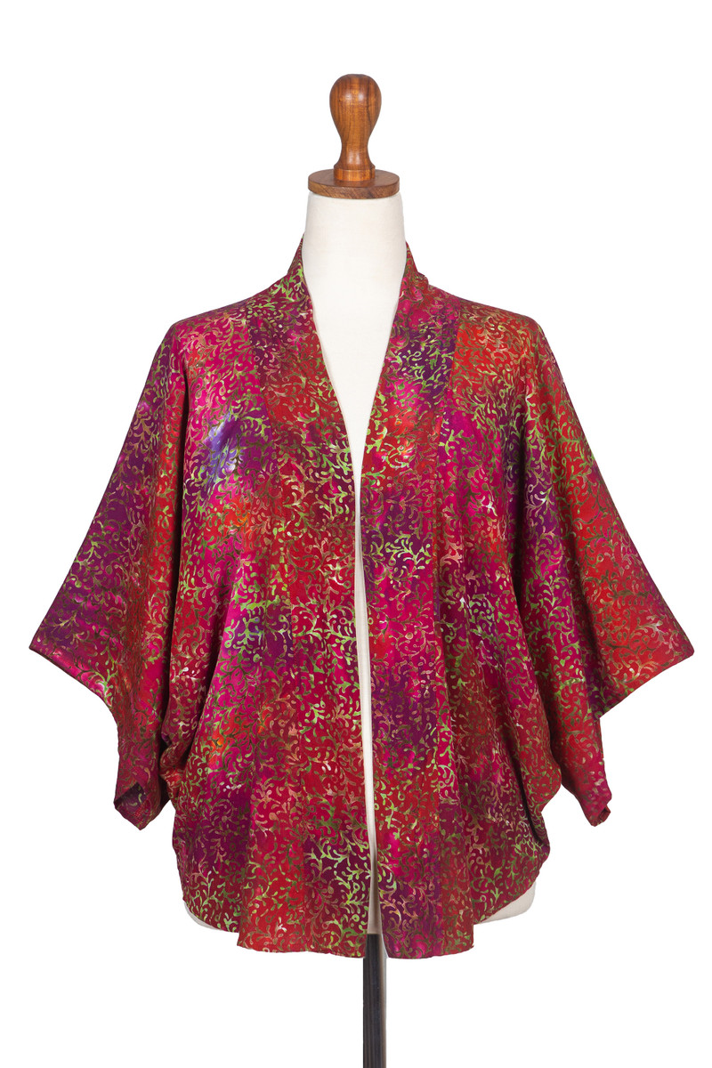 A versatile one-size-fits-most kimono jacket designed by Galuh Kenanga features a loose fit, lovely three-quarter sleeves and more than enough charm to wear it on just about every occasion. The red, green and purple jacket is crafted from rayon and embellished with beautiful vine motifs hand-stamped with the traditional Balinese batik technique.