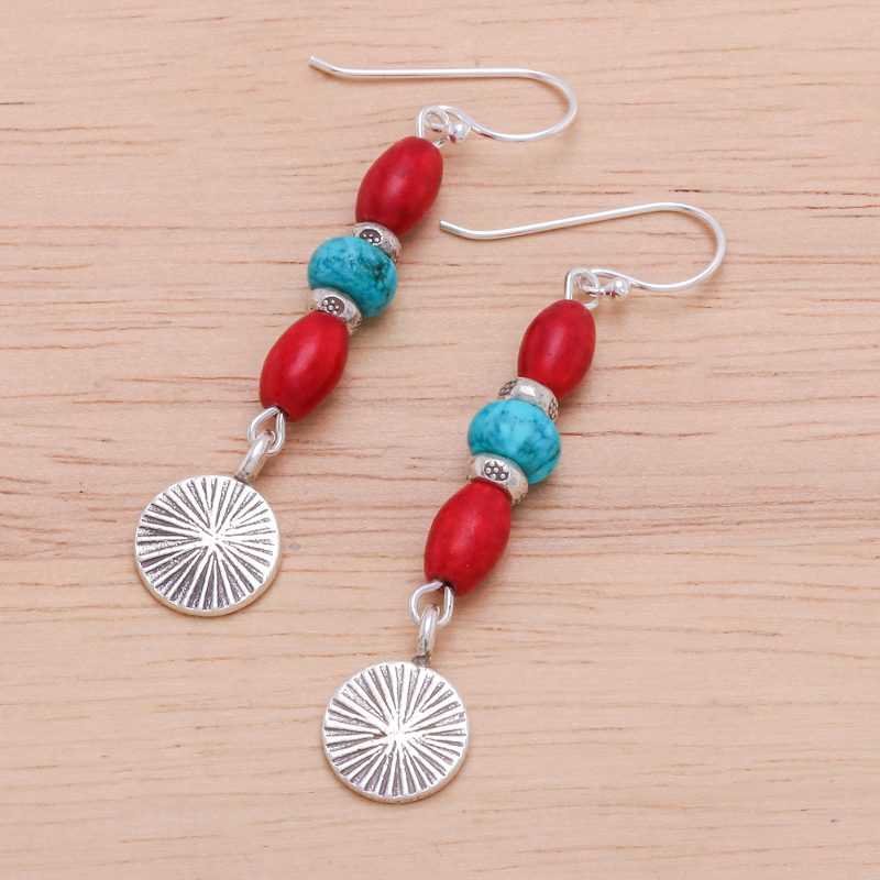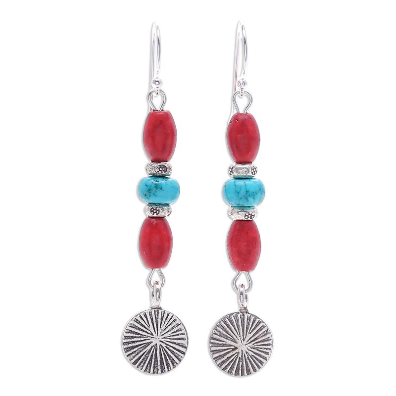 Bright beads make these head-turning earrings designed by Tipa the perfect choice for a breezy getaway. The Thai artisan uses 950 Karen silver to create the earrings, engraving the precious metal with a radial motif. Dyed howlite beads and reconstituted turquoise add irresistible color, while sterling silver hooks provide the finishing touch.