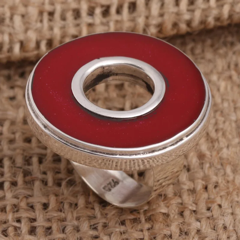 This generously sized cocktail ring, crafted from red resin and sterling silver, is presented by Kadek Satya. Kadek hails from Celuk--the Balinese village renowned for its high-quality gold and silver jewelry.