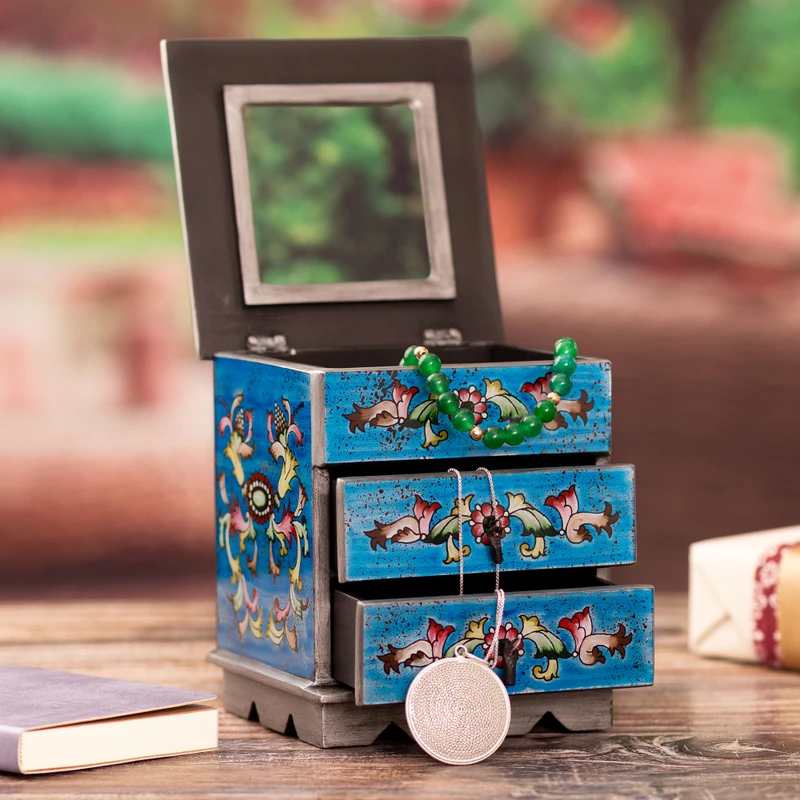 Backed by our 100% Happiness GuaranteeA celestial blue cloud embraces this classic jewelry box, designed like a chest of drawers. The upper tray features a mirror, and the two drawers below organize personal treasures. Asunta Pelaez hand-paints the motifs on the reverse side of glass panes with golden details.