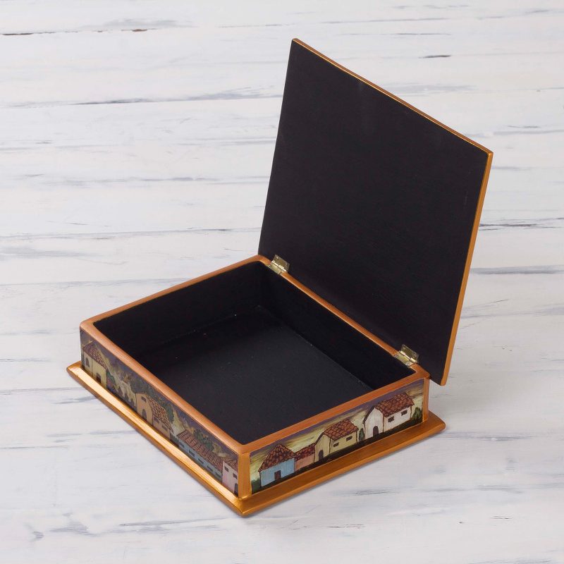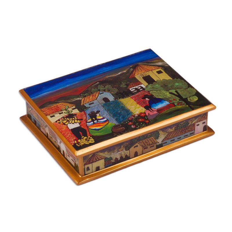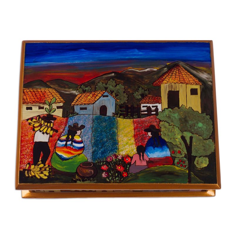 Backed by our 100% Happiness GuaranteeWorking together as a close-knit team, an Andean family works on the fields. The older women pick flowers, father carries bananas, and the daughter watches them encouragingly. Felicita Espinoza paints the scene by hand with sublime detail, on the reverse side of glass. There are painted glass panels on every side of this captivating jewelry box.