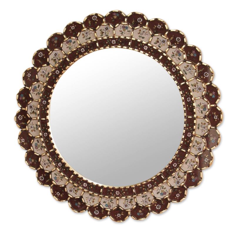 Flowers bloom in fields of beige and burgundy, caressed by golden sunshine. Marcos Luzalde crafts a circular wall mirror of mohena, a fine Peruvian hardwood. Painted by hand on the reverse side of glass, the motifs reveal a beautiful clarity, while applications of bronze leaf add shine.