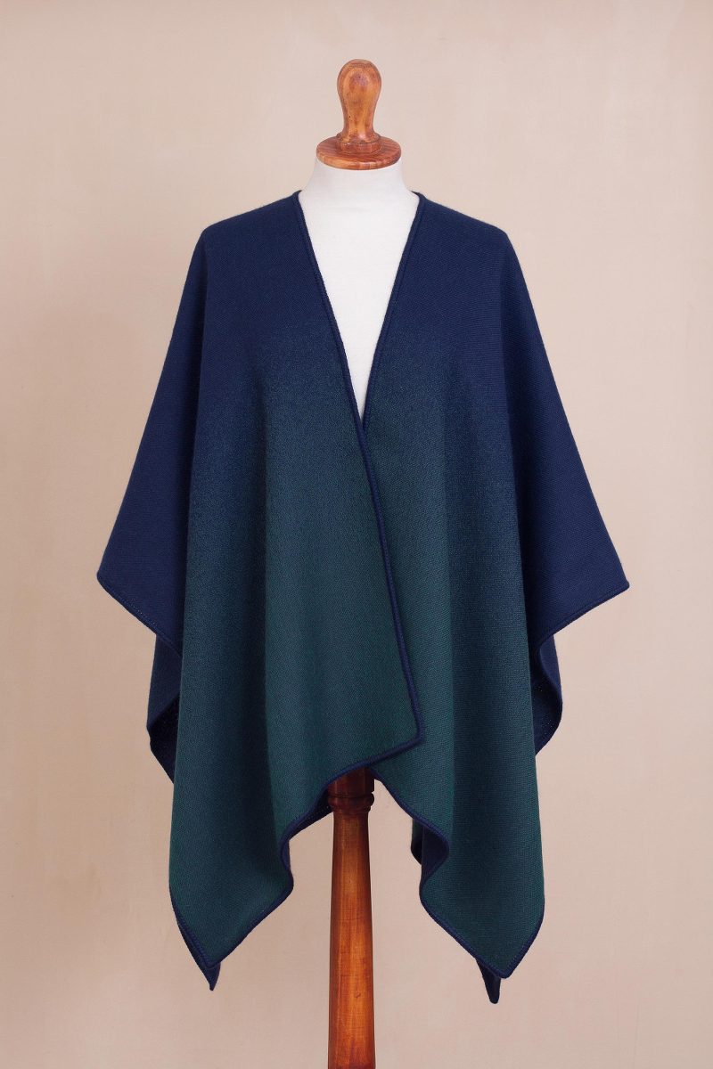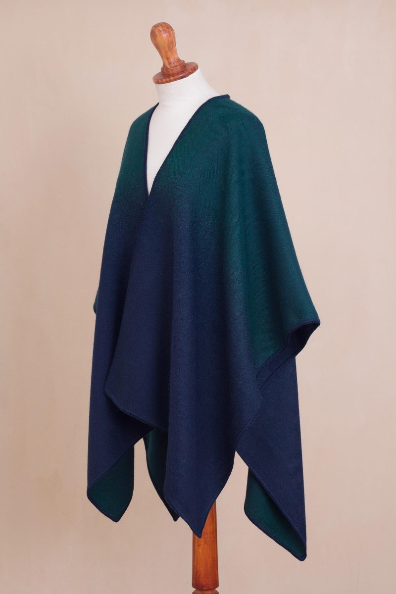 Backed by our 100% Happiness GuaranteeInspired by the colors of Amazonian rainforests and the ancient weaving traditions of the Altiplano, Peru's Isidoro C'cahuantico designs this inviting alpaca-blend ruana. The ombré hues deepen from kelly green to dark navy on one side, and reverse from navy to green on the other.