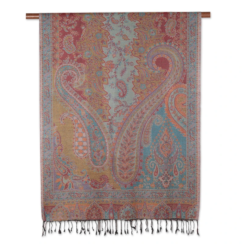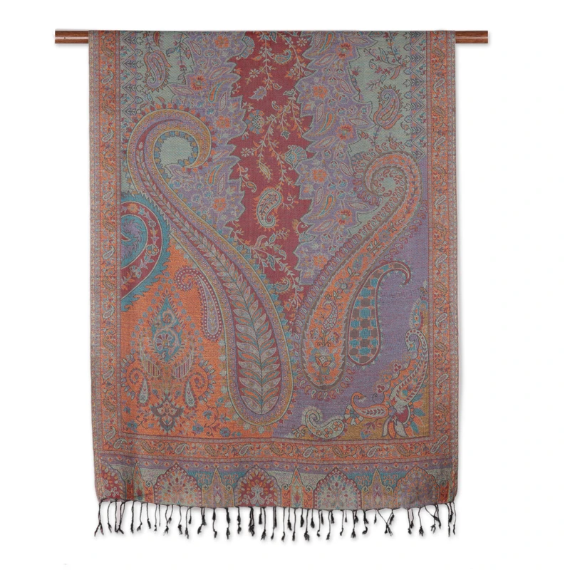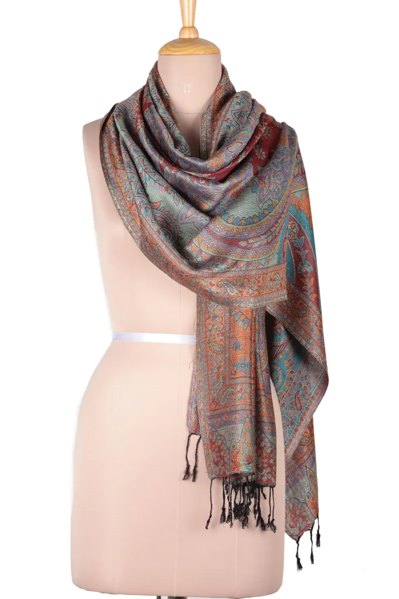This jacquard-style shawl is woven of softly draping modal yarns with a paisley and floral motif. Presented by Sajad in India, the muted jewel tones make this a versatile complement to any wardrobe.