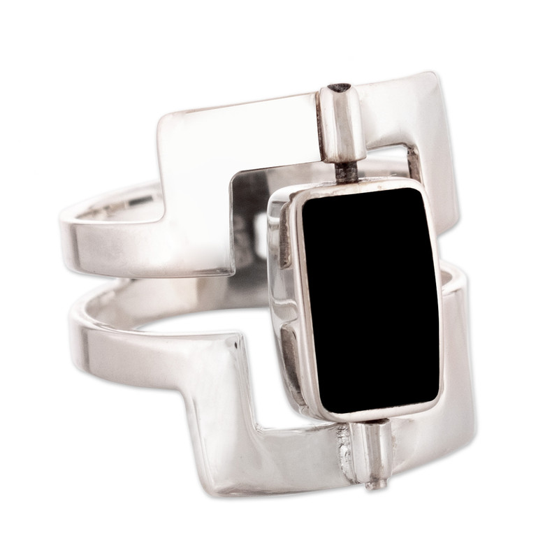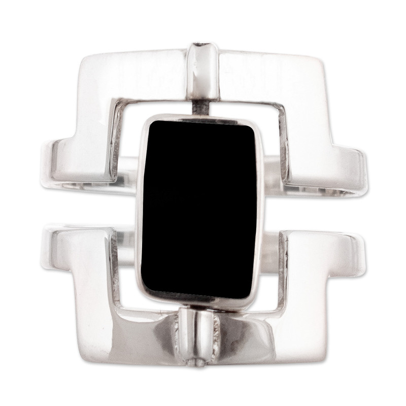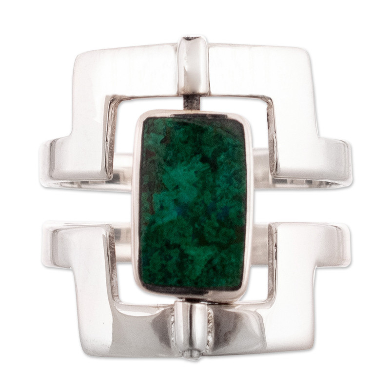 A sage can be wise or enigmatic, and so can you with this exquisite creation from the Andes. Infused with a minimalist allure, this sterling silver cocktail ring by Fermin of Peru shines with sophistication, boasting a reversible design: one side with a mysterious black onyx and the other with an enchanting chrysocolla.