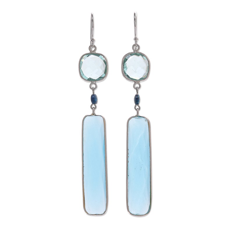 You'll look as cool and collected as an ice queen in these chilly dangle earrings designed by Thailand's Somluck Komolmith. A long blue chalcedony stone hangs from a faceted blue glass square, while a tiny blue chrysocolla rests in between. Rhodium-plated brass bezel settings give the earrings a high polish, while sterling silver hooks complete the pair.