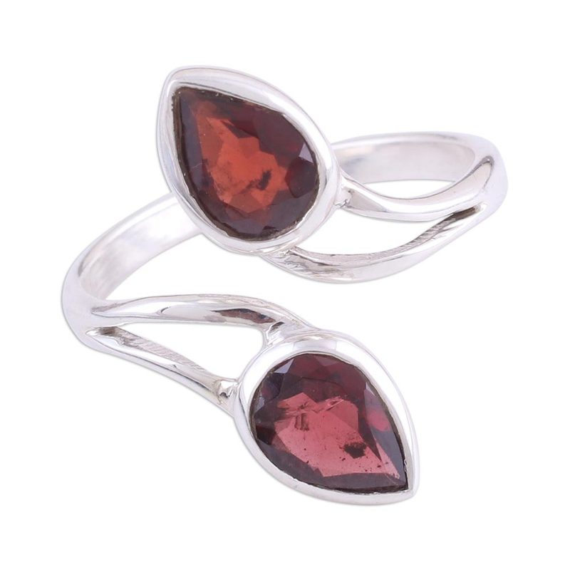 A twisting vine is handcrafted of rhodium plated sterling silver, circling the finger with a fascinating gleam. Presented by Parul, this Indian wrap ring is completed with over one carat of teardrop garnet gems that sparkle in their bezel settings.