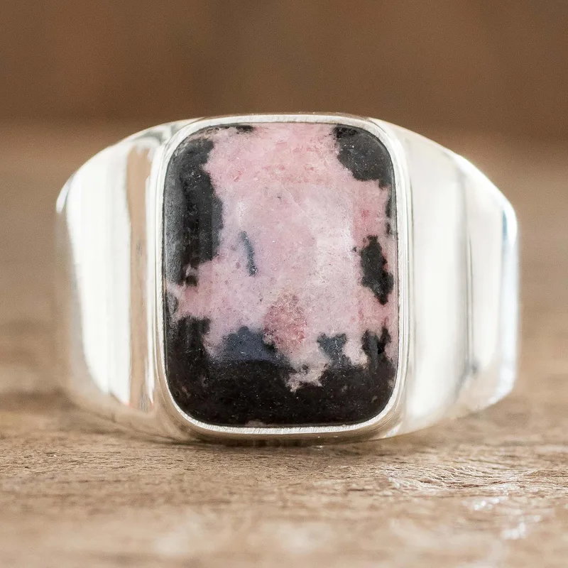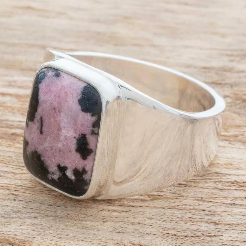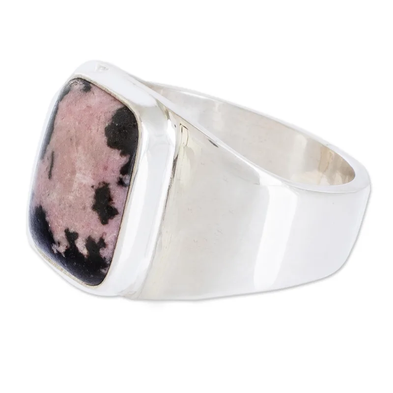 Delivery EstimateThis prominent men's ring is the design of Zandra Lorena Sajbin from Guatemala. The wide high-polished band crafted of sterling silver features a bold rectangular stone of rhodonite, giving it its unique pink color. This ring will surely catch everyone's eyes.