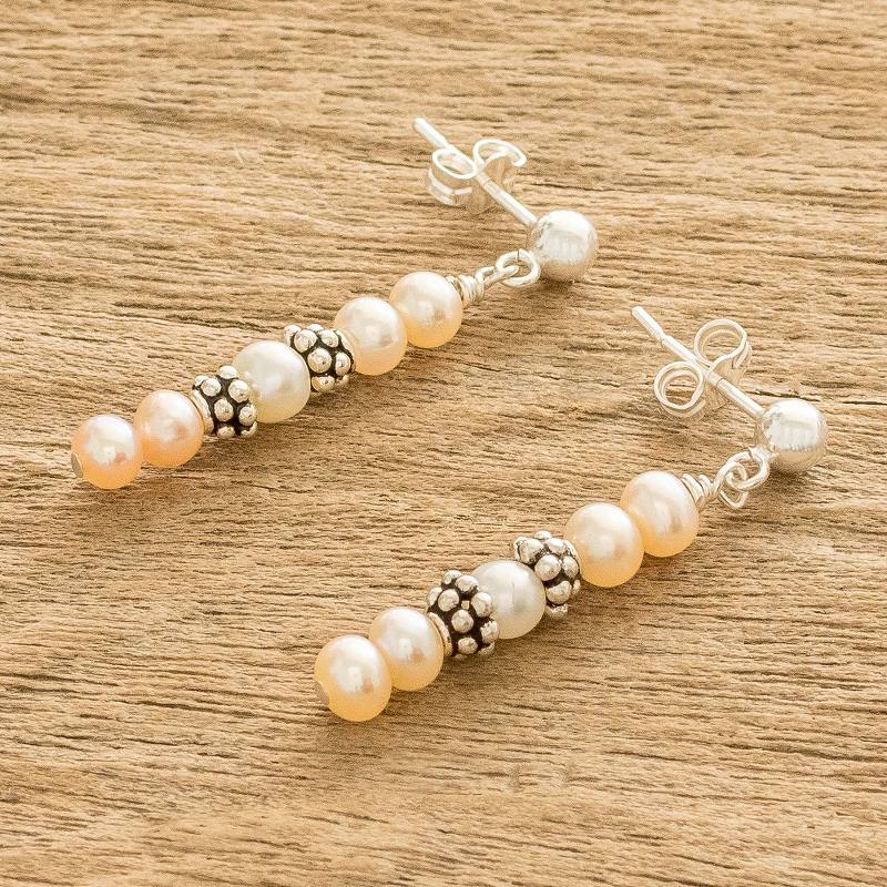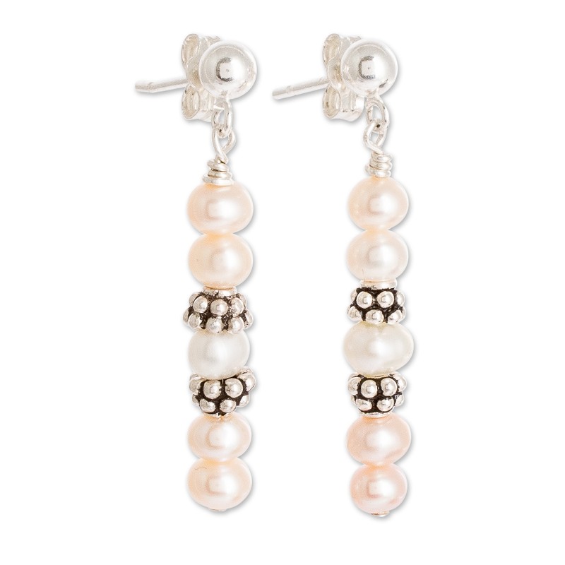 Delivery EstimateFew things are more classic than a strand of pearls. Guatemalan craftswoman Mirian Bruten adapts this concept to this pair of lovely earrings. Among natural pale pink cultured pearls, she adds textured beads made of sterling silver that each flank a white pearl.