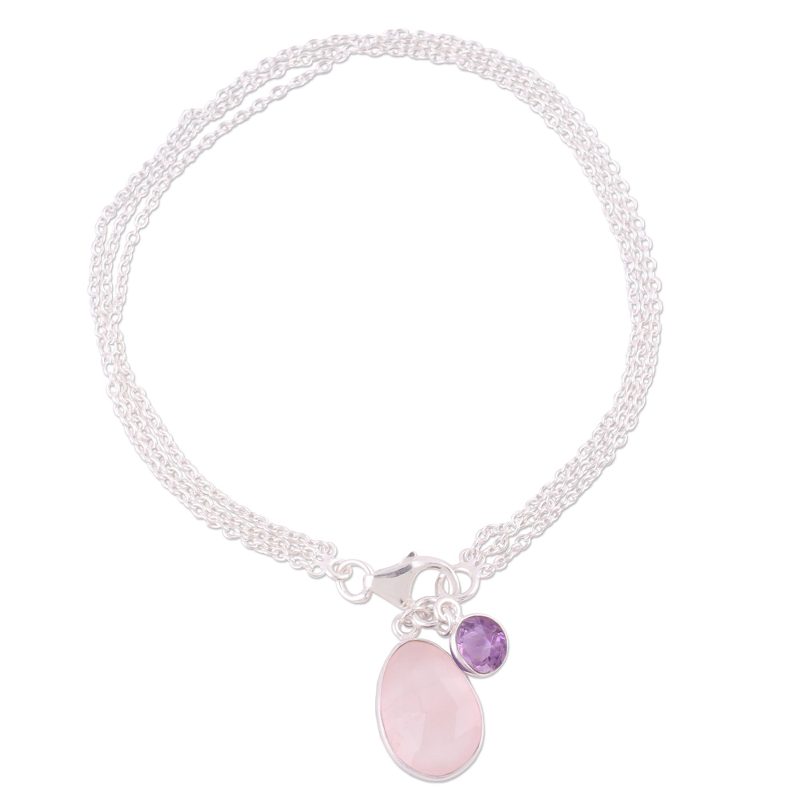Backed by our 100% Happiness GuaranteeA large rose quartz and small amethyst, totaling over four carats together, dangle from the wrist in this twinkling charm bracelet from India. Inspired by both traditional and modern aesthetics, Neetu Barathi designs the bracelet. She works with her brother, hosting the stones on three lengths of slender sterling silver cable chain.