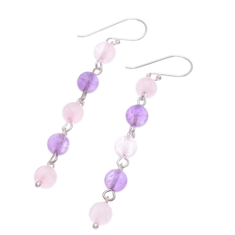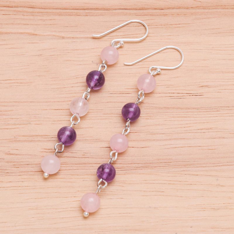 Pale pink and rich purple gems mingle in Matta's twinkling dangle earrings. The artisan alternates amethyst beads with rose quartz orbs to create the earrings, joining the gems with sterling silver links and finishing the pair with gleaming silver hooks.