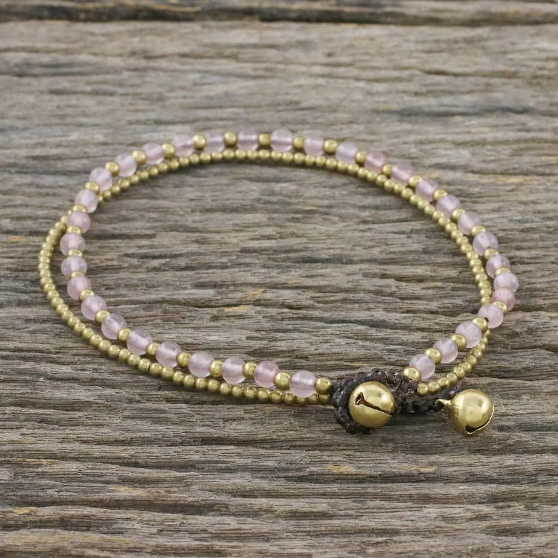 Thai artisan Tiraphan Hasub carefully chooses stones of natural rose quartz, beading the length of this anklet. The beads are alternated with petite brass beads, accompanied by a beaded strand of brass. The fashionable anklet is completed with two ringing brass bell buttons, giving it an adjustable length.