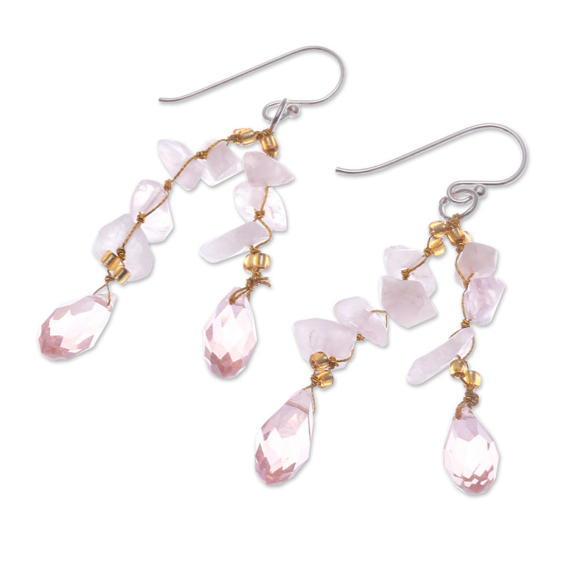 Strung on silk strands, pink rose quartz stones float above golden glass briolettes that glisten with a crystalline beauty. Thai artisan Nareerat designs this lovely pair of dangle earrings, adorning the ears on hooks of sterling silver.