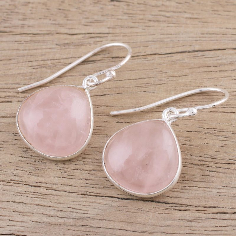 Two elegant teardrops of rose quartz dance below the ears in this pair of dangle earrings from India. Neetu Barathi chooses rose quartz as a stone that supports the circulatory system, framing each with high-polish sterling silver that hangs on hooks.
