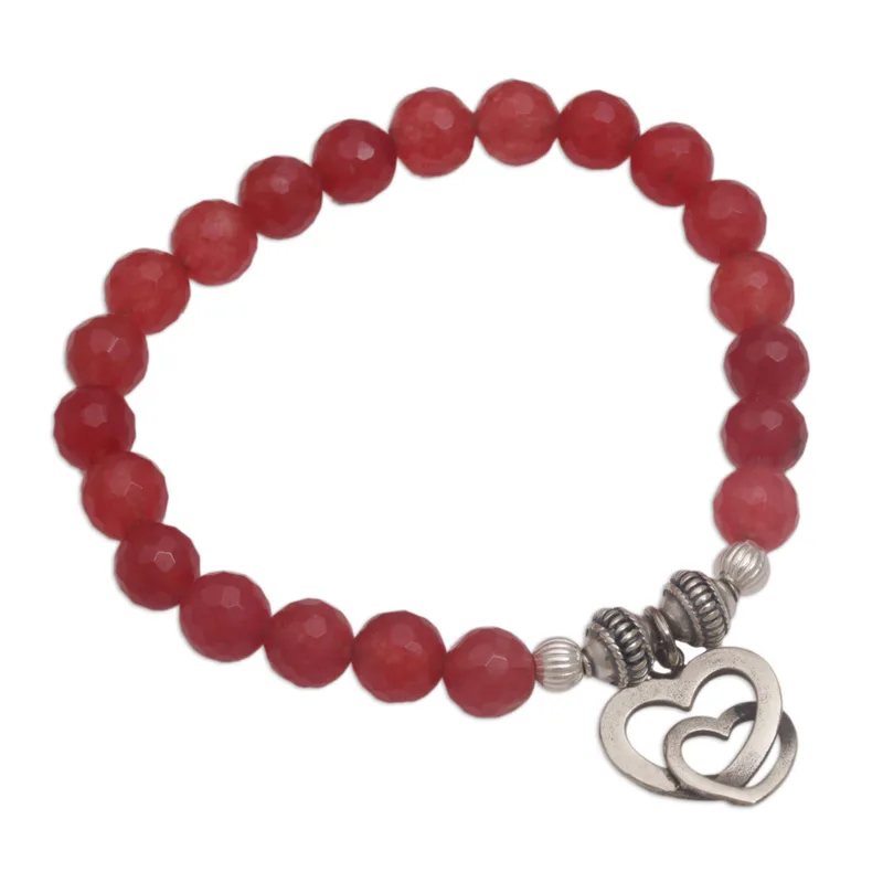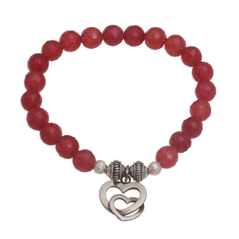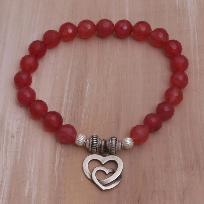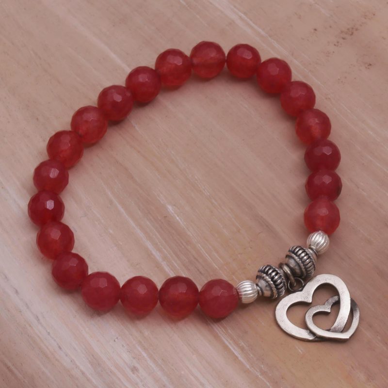 Stones of glistening agate circle the wrist with rosy hues, punctuated by sterling silver beads and an elegant charm that depicts two interlinked hearts. Expressing her love, Bali's Ketut Sulastri designs this beaded bracelet, working with local artisans to craft it. This eye-catching accessory is perfect as a gift or for personal wear.