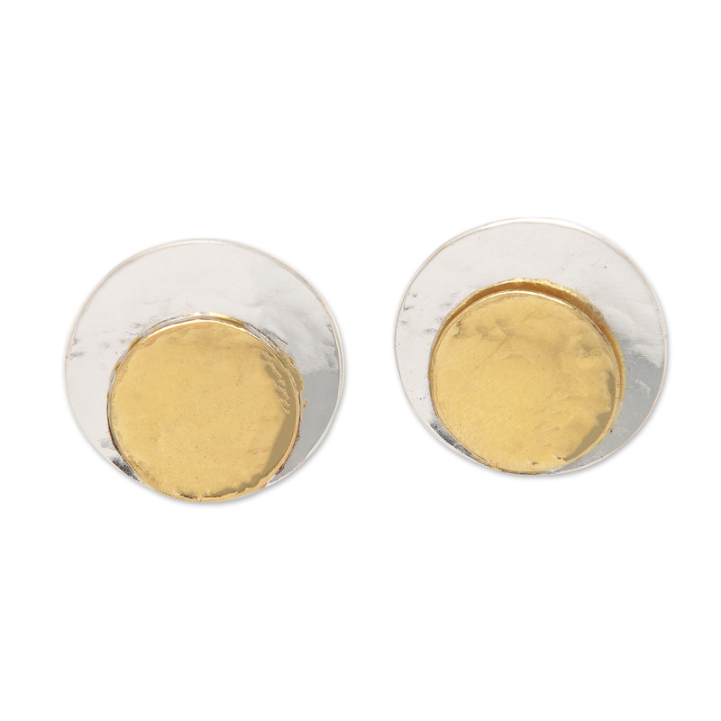 The ethereal aura of paradise will now crown your days with elegance and light. Crafted in Bali by Nyoman Nartawan, these button earrings feature a graceful round structure made from hammered sterling silver, adding a distinguished touch to the design. As the central elements, 22k gold-plated brass accents provide a radiant glare, with their luminous hue symbolizing victory.