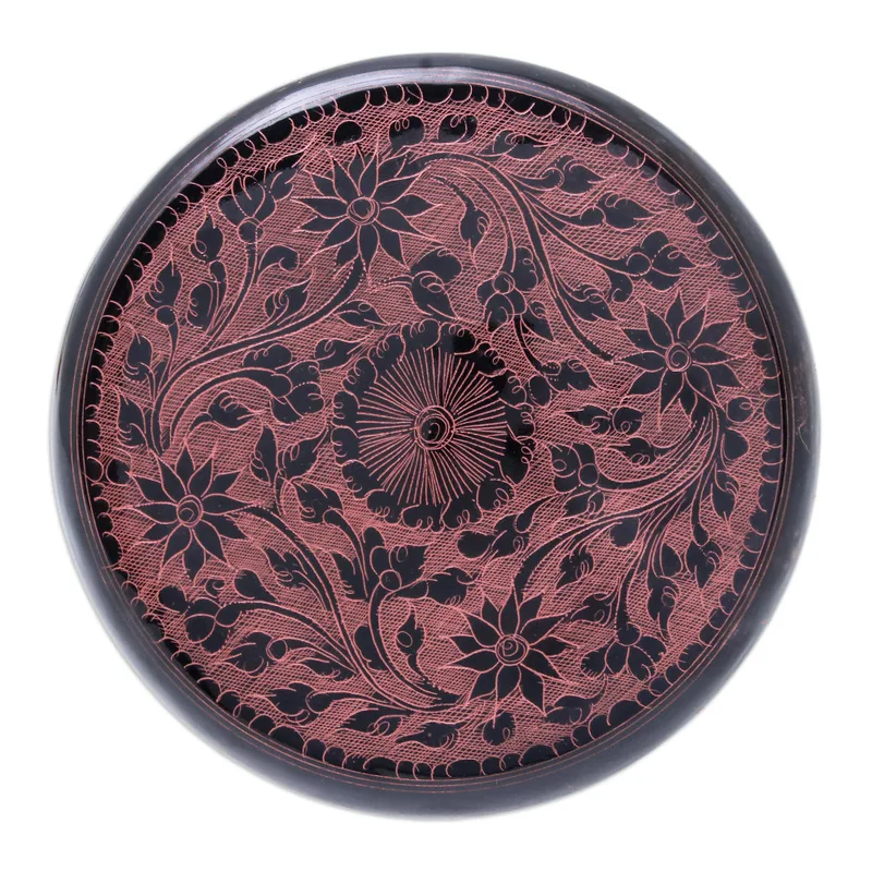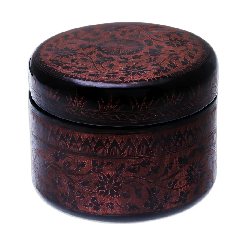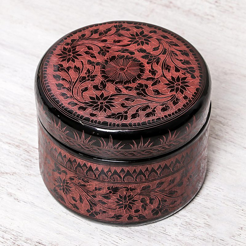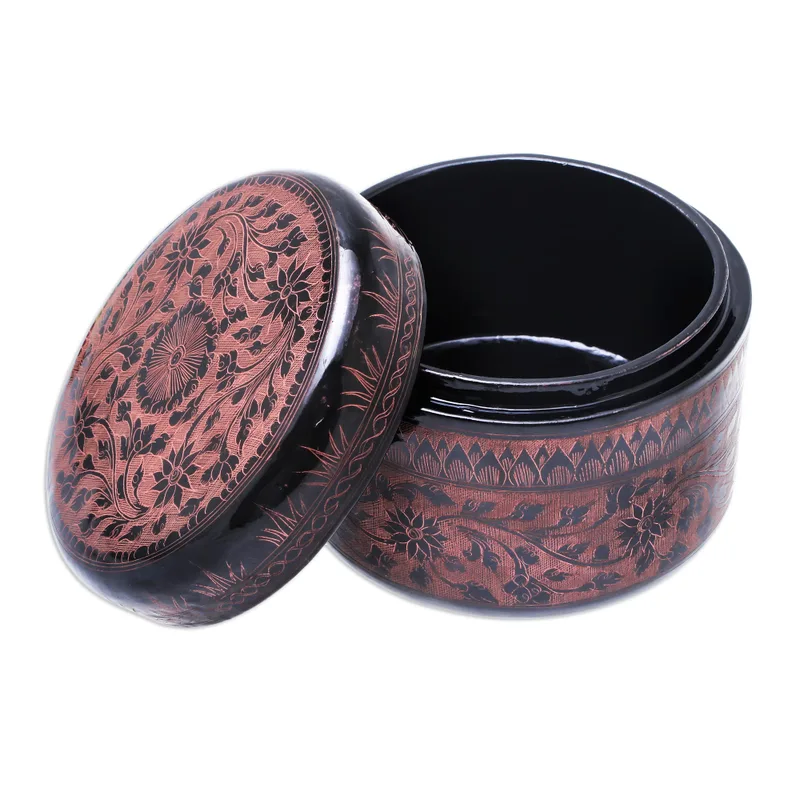 Crafted of mango wood with a shiny lacquered finish in black, this round decorative box is designed by Thai artisan Nantana Sompamitre. She engraves intricate pink floral motifs over the box's surface for a striking addition to your home decor.