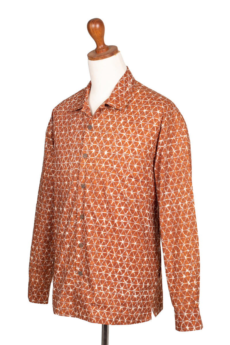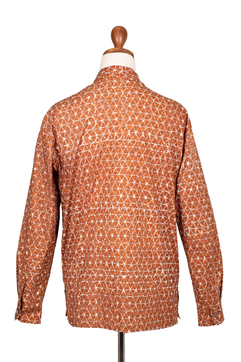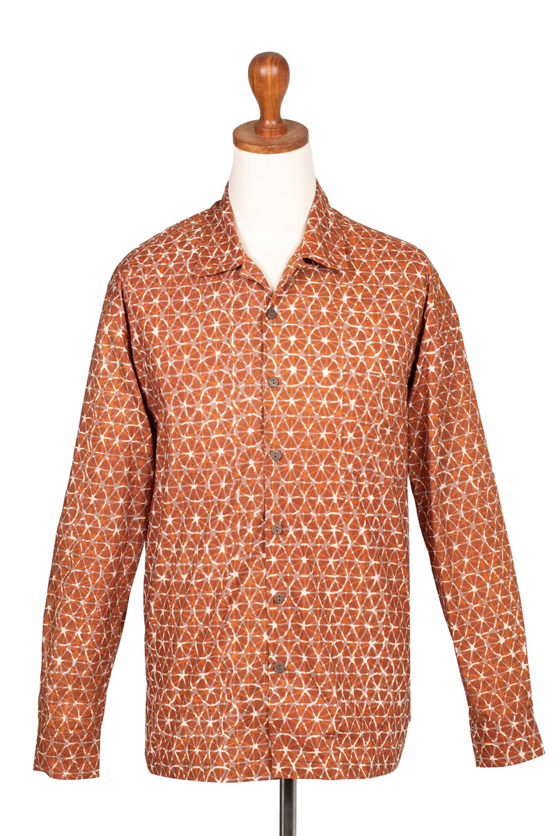 Backed by our 100% Happiness GuaranteeBali's elegance expresses itself through a series of batik motifs meticulously placed around this cotton shirt by Donald Wira Putra. Choosing a palette of russet and salamander hues, the artisan embellishes the garment with a myriad of geometric motifs, creating a dapper design. On top of that, the shirt features a collared neckline, long sleeves, and a convenient pocket on the chest.
