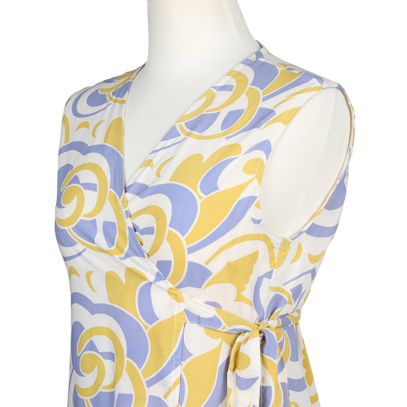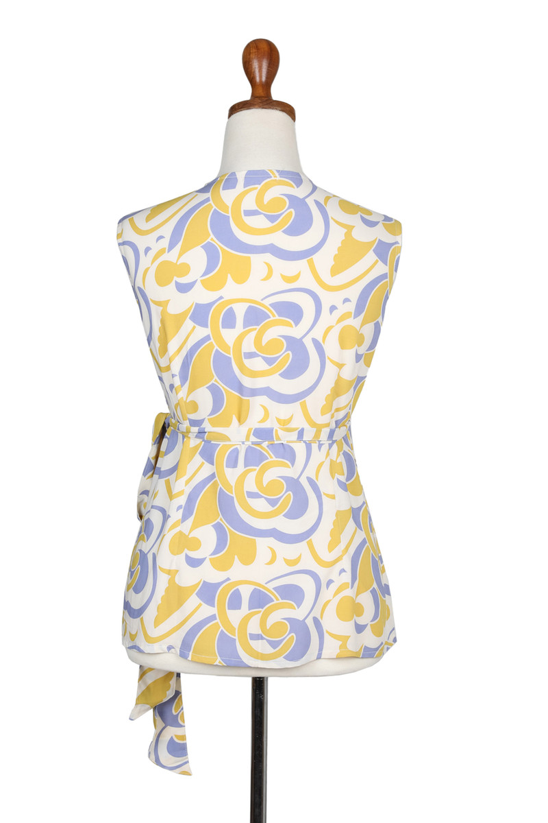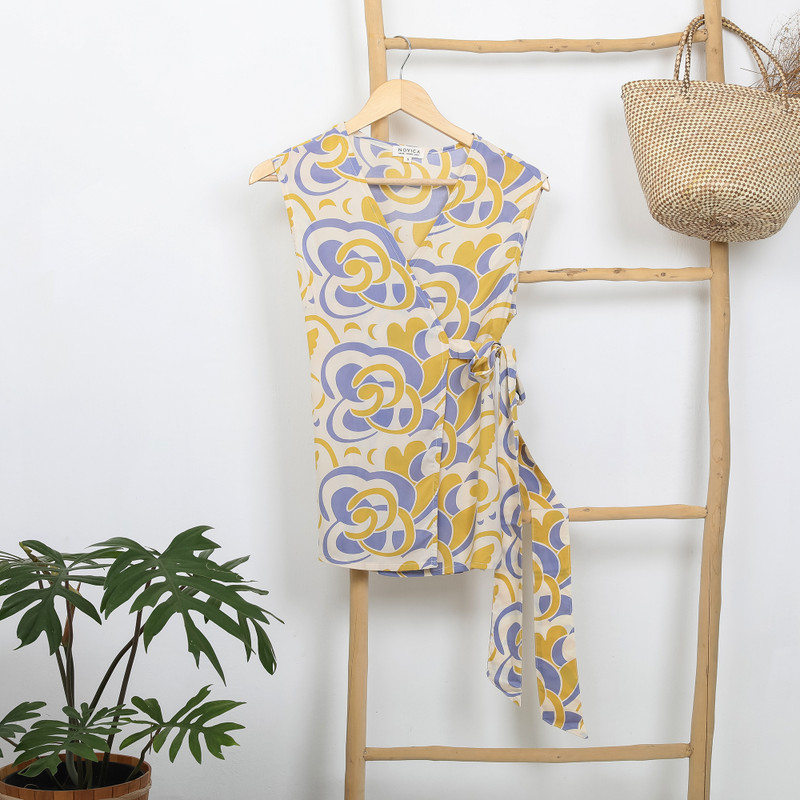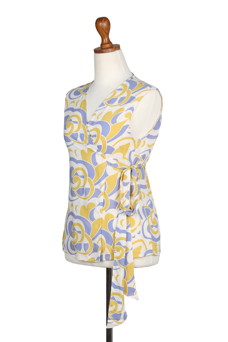 Backed by our 100% Happiness GuaranteeWelcome the arrival of warm days in this cheerful wrap blouse designed by Hari and Arthur in Bali. Crafted from 100% rayon, the airy sleeveless blouse features a screen printed leaf motif, a flattering scoop neck, and a wrap-style tie closure that adds feminine flair to your silhouette.